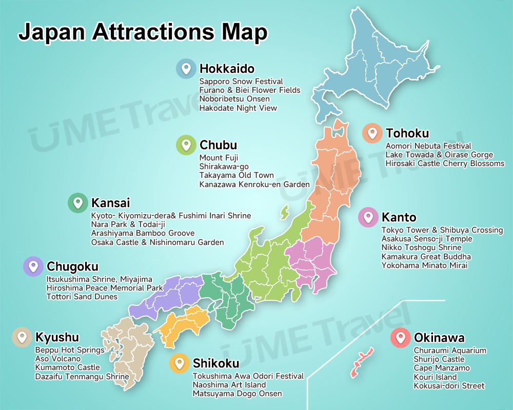 Discover Japan one region at a time with this easy-to-read map of Japan's attractions — your shortcut to understanding where the country's most iconic landmarks, cultural treasures, and natural wonders are located. From the snow-covered landscapes of Hokkaido to the tropical beaches of Okinawa, each region has its own unique character, flavours, and experiences.