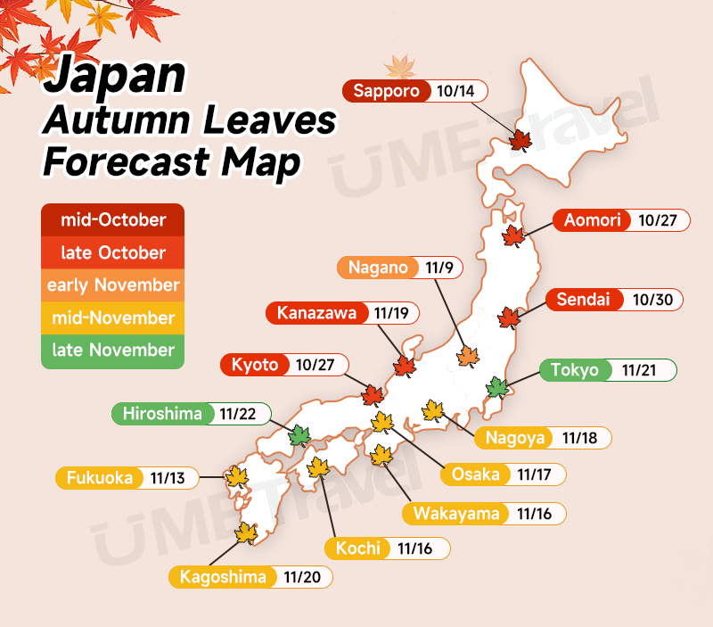 There are fiery red maples in Kyoto, and golden trails in Tokyo and Fukuoka. Whether you dream of strolling through temples under blazing trees or driving through glowing hillsides, this autumn leaf forecast is your perfect starting point. Let's chase the colours together!