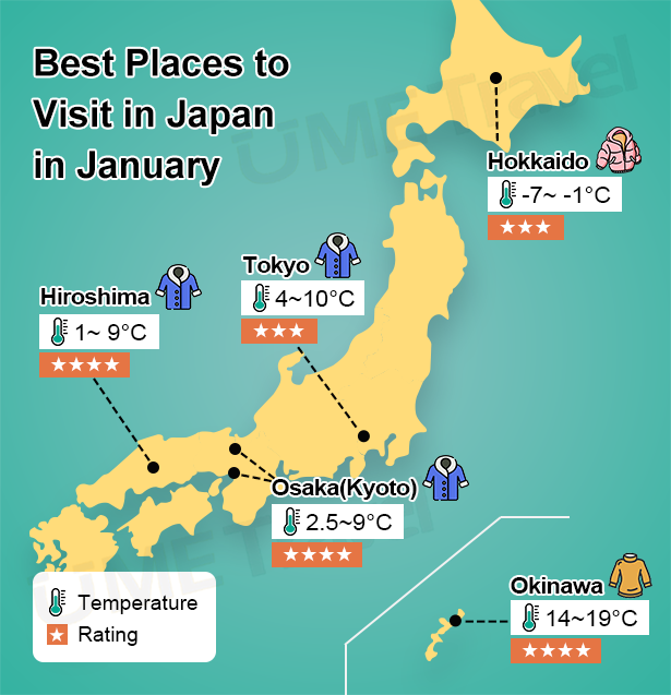Check out the weather map we've created for you, which briefly marks the temperatures and recommends the travel index for five major cities in Japan in January.