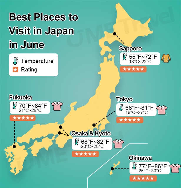 June marks the start of Japan's rainy season, known locally as the 'Tsuyu(plum rain)'. Temperatures continue to climb, with most major cities averaging between 19 and 28 °C (66 and 82°F), and humidity becomes increasingly noticeable.